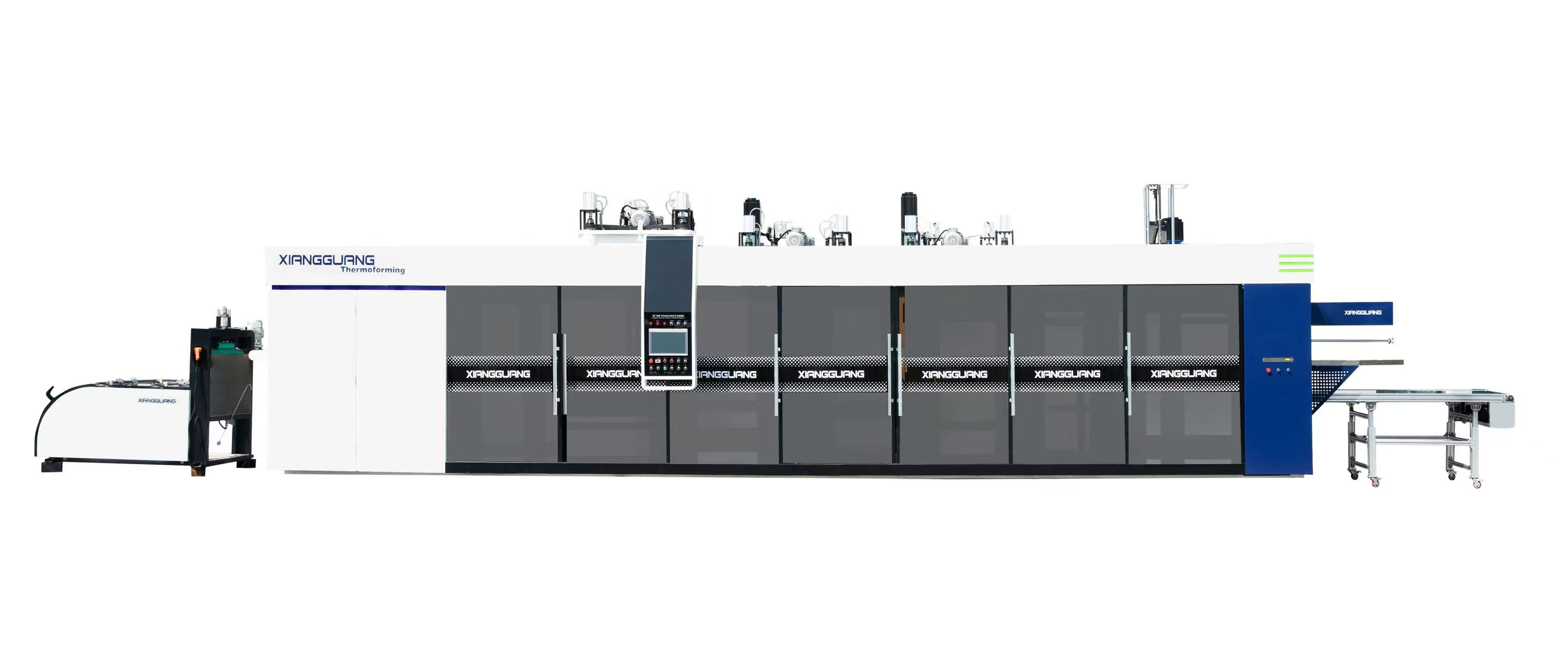 A、特点:XG-A-3-3型高效程控塑料气压热成型机,应用塑料片材成型工艺技术,是集机、电、气一体化设计,采用微电脑及工控可编程PLC控制,整个系统HMI(人机界面)。方形遂道式进口辐射加热器,凹凸模皆可成型,激光刀片冲切,其工艺流程:加热、成型、冲孔、裁切、堆垛、计数等多工位生产线。生产线可同步同时运行,采用时下的成型工艺技术,减少人工、防止二次污染、节省材料、提高产品品质及产品合格率、成倍提高生产效率、操作便捷、可靠性好、功能性强、自动化程度高,用于片材热成型和产品自动冲孔、裁切一体的自动化生产线。